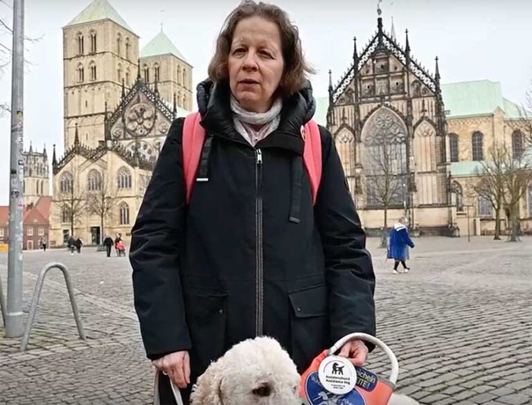 MÜNSTER. Als Conni Drauschke am Domplatz mit ihrem Pudel aus dem Bus steigt, bleibt eine ältere Dame stehen: „Das ist aber ein süßer Hund.“ Doch der Hund mit dem Namen Sherlock beachtet die Frau kaum, seine Aufmerksamkeit gilt nur Conni Drauschke. Als Assistenzhund hilft ihr der Königspudel schon seit vier Jahren. Meistens freue sie sich über die Aufmerksamkeit, aber es gäbe auch Tage, da sei „zu viel Aufmerksamkeit anstrengend“.